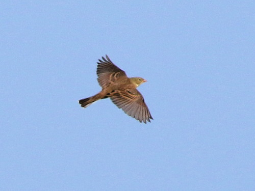 A wet and windy start to the day cleared into calm, sunny and warm conditions. A walk around Norwick produced 60 Ruff, a Sparrowhawk, a female Redstart, 2 Blackcap, 2 Garden Warblers, a Lesser Whitethroat, a Goldcrest, a Pied Fly and best of all a male Ortolan that I picked out in flight just as I was leaving that conveniently pitched down in a 'hedgerow'. Baltasound seemed quiet with just a 4 Willow Warblers, a Chiffchaff and the Spotted Flycatcher still at the School. Haroldswick produced a female Redstart, a Garden Warbler and a Willow Warbler and just a Whinchat was seen at Burrafirth.