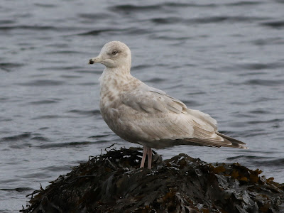 A ringtail Hen Harrier was hunting over moorland just north of Burravoe, Yell where I saw Golden Plovers engaged in flight display for the first time this year and an overflying Snow Bunting. A drive along the foreshore at Uyeasound produced better views of the Kumlien's/Thayer's Gull under heavily-overcast skies. Needless to say this intriguing Gull always looks at its darkest under overcast skies and today's views and the images below were obtained shortly before it was raining. Now, armed with Amar Ayyash's latest appreciation of the 'Iceland Gull' complex in his North America Gull Guide (2024), it's interesting to revisit its subspecific identification and again ponder were the arbitrary lines are drawn in a continuum! It was seen alone today, but on a previous occasion, it has been seen to be the same size as the smallest accompanying Herring Gulls.